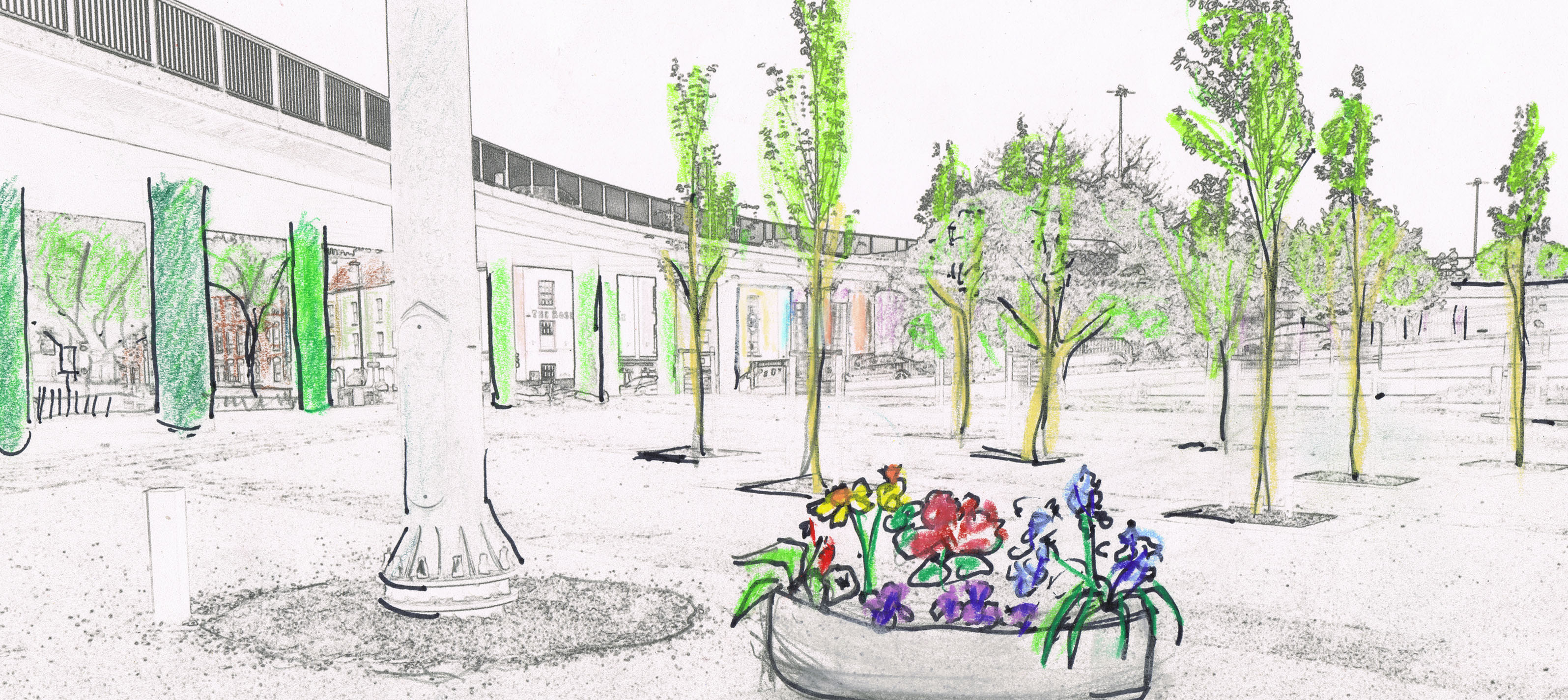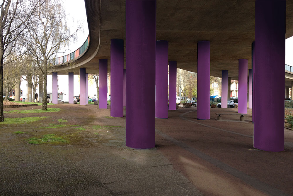 Artists Dave Bain and Oli Timmins are developing some fantastic ideas for involving local people in painting the pillars in different colours and this will be a chance for anyone in the community to have a go. Here are some visuals of how the painted pillars could make a difference to the space, to make it more striking and distinctive. We also have plans to create new planters on a more architectural scale, with Bristol Wood Recycling Project.
