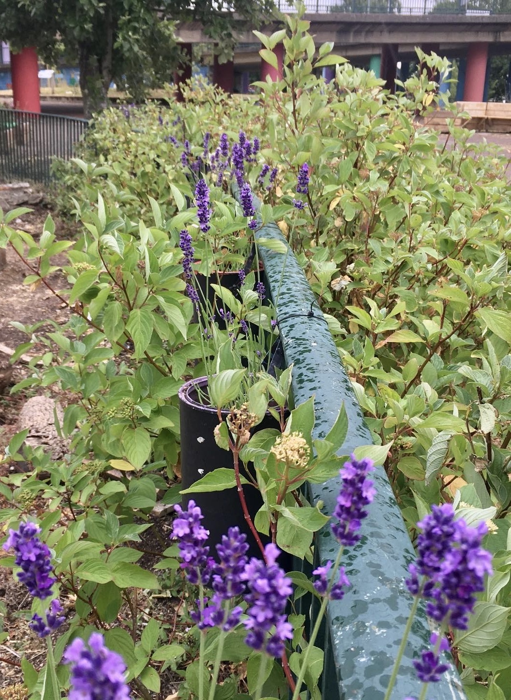 Over the years we have been learning which plants cope best in our urban climate and we very rarely need to water out planters, rockeries, sedum beds or rain beds, but during prolonged hot, dry spells we use the rainwater butts and occasionally put a local call out for people to bring water to the piazza
